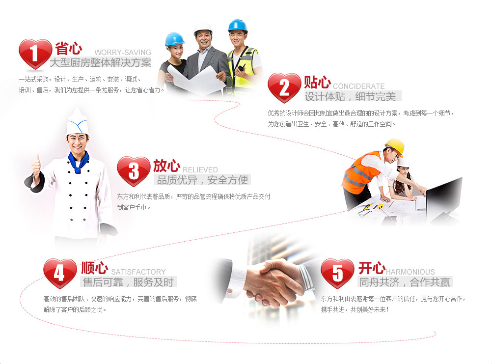 與傳統(tǒng)的"生產(chǎn)商"或"銷售商"不同,東方和利并不僅僅生產(chǎn)或銷售廚房設(shè)備,而是為客戶提供廚房整體解決方案的"服務(wù)商"。我們以客戶需求為中心,采用"五心"服務(wù)體系全程保障,為客戶提供廚房設(shè)計(jì)咨詢、設(shè)備生產(chǎn)、運(yùn)輸、安裝、調(diào)試、培訓(xùn)、售后等全套服務(wù),讓您體驗(yàn)到管家式服務(wù)的周到與便利。