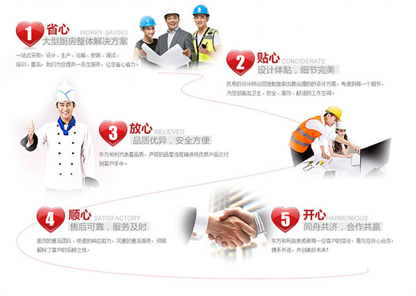 東方和利廚業(yè)首次制定了"五心"服務體系,即采用"省心、貼心、放心、順心、開心"的"五心"服務體系全程保障,為客戶提供廚房設(shè)計咨詢、設(shè)備生產(chǎn)、運輸、安裝、調(diào)試、培訓、售后等全套服務。