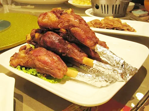 5.鍋中倒入牛油加熱后,把煮好的羊棒炸至棗紅色撈起(整根做的將羊棒骨端包上錫紙即可上桌食用)。