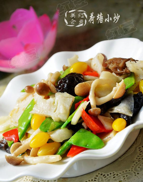 蓮藕,80g;荸薺,6個(gè);白果,50g;荷蘭豆,50g;泡發(fā)的木耳,30g;白玉菇,50g;紅椒,30g。