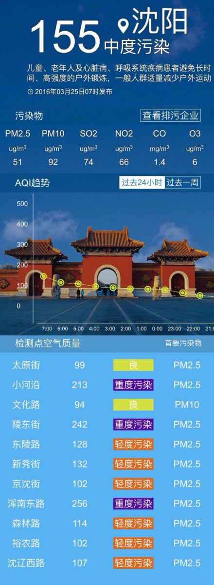 接下來共同關注沈陽未來幾天的具體天氣情況:今天白天天氣晴朗,最高氣溫將提升到11℃左右,北風3-4級,空氣質量中度污染;今天夜間最低氣溫-5℃左右。