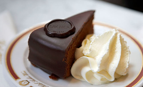 薩赫蛋糕由兩層甜巧克力和中間的杏子醬構(gòu)成,蛋糕上面有巧克力片,它是代表奧地利的國(guó)寶級(jí)點(diǎn)心。