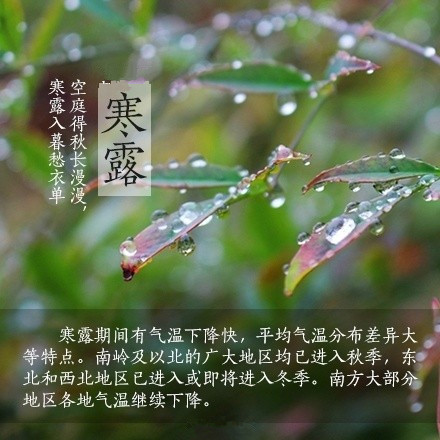 露氣寒冷,深秋節(jié)令,沈陽最低氣溫已經(jīng)跌到零度,看來冬天真的離我們不遠了;北方呈深秋景象,白云紅葉,偶見早霜;