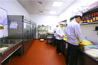 廚房的燈光:餐廳的燈光重文化,廚房的燈光重實用。這里的實用,主要指臨爐炒菜要有足夠的燈光以把握菜肴色澤;案板切配要有明亮的燈光,以有效防止刀傷和追求精細的刀工;出菜打荷的上方要有充足的燈光,切實減少雜草混入并流入餐廳等等。廚房燈光不一定要像餐廳一樣豪華典雅、布局整齊,但其作用絕不可忽視。