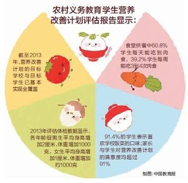 自該《意見》頒發(fā)以來我國積極在全國范圍內(nèi)實施農(nóng)村義務(wù)教育學生營養(yǎng)餐試點學校項目,為學校增添了蒸飯車、電熱灶、消毒柜等食堂設(shè)施設(shè)備,給各實施學校配備牛奶加熱箱、滅蠅燈、溫度濕度計、消毒燈、保鮮柜等,配齊食堂設(shè)施設(shè)備。目前農(nóng)村義務(wù)教育學生營養(yǎng)改善計劃已覆蓋所有國家級貧困縣,全國已有上千所農(nóng)村貧困學校,能夠為學生供應(yīng)熱食正餐,讓3700萬名農(nóng)村學生受益,營養(yǎng)健康狀況得到顯著改善 。