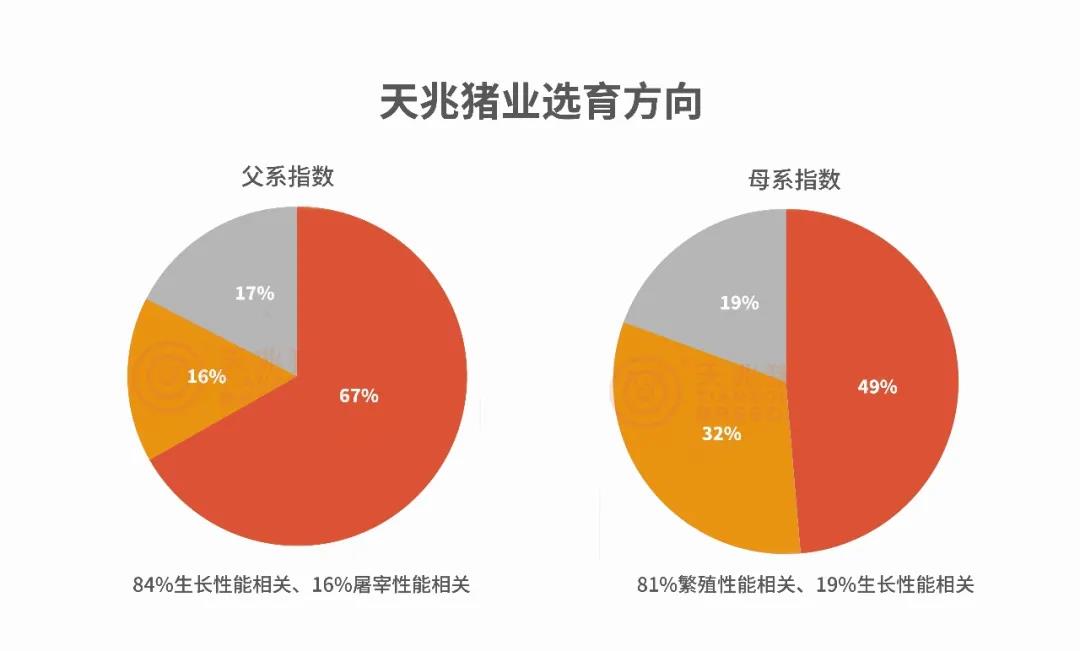 天兆豬業(yè)經(jīng)過充分的市場(chǎng)調(diào)研,針對(duì)中國(guó)市場(chǎng)的需要,結(jié)合實(shí)際生產(chǎn)條件,以引進(jìn)的加系、法系種豬為基礎(chǔ)進(jìn)行持續(xù)選育,并在選育方向上強(qiáng)化了繁殖性能、生長(zhǎng)性能、屠宰性能等性狀所占的權(quán)重,通過十多年的持續(xù)選擇,不斷提升種豬綜合性能水平。