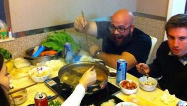 他曾明確表示,雖然愛吃中國菜,但絕不吃頭、腳,以及內(nèi)臟。 然而后來他吃毛肚能一個(gè)人吃3.4盤……吃鴨血也是……后來干脆老老實(shí)實(shí)跟著我們吃,因?yàn)樗X得中國的一切都好吃。