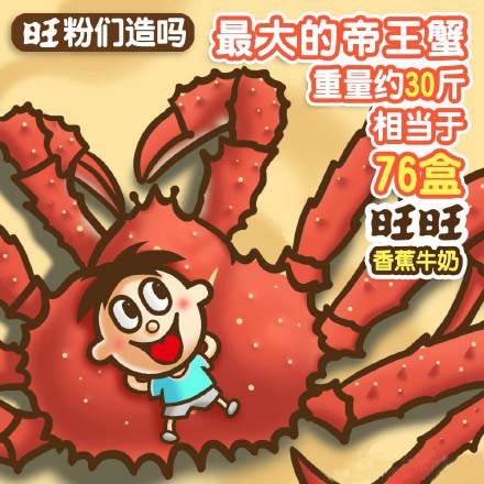 迄今人們捕獲最大個頭的帝王蟹來自北太平洋,重量約33磅(約30斤),相當于75盒旺旺香蕉牛奶?。?!這樣一只大螃蟹足以讓一個三口之家吃上一個星期!