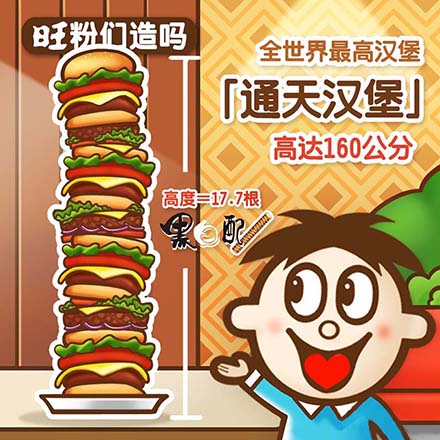 全世界目前最高的"通天漢堡"由某英國(guó)漢堡店老板制成!高160公分、比旺仔還高呢!這個(gè)漢堡排了10個(gè)芝士漢堡,每個(gè)都夾熏肉、肉醬、意大利面、香腸、肉丸、牛肉、色拉。高度嚇人,熱量更嚇人,高達(dá)3萬(wàn)卡路里!