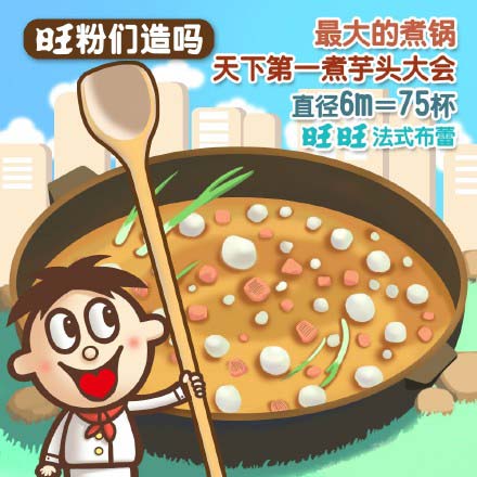 最大的煮鍋來(lái)自日本山形縣舉行的"天下第一煮芋頭大會(huì)",中間一架大鍋寬達(dá)6米,相當(dāng)于75杯旺旺法式布蕾的直徑!兩位師傅開著消毒后的挖掘機(jī)煮,一共使用3噸芋頭、1.2噸牛肉、3500根大蔥,供3萬(wàn)人品嘗。