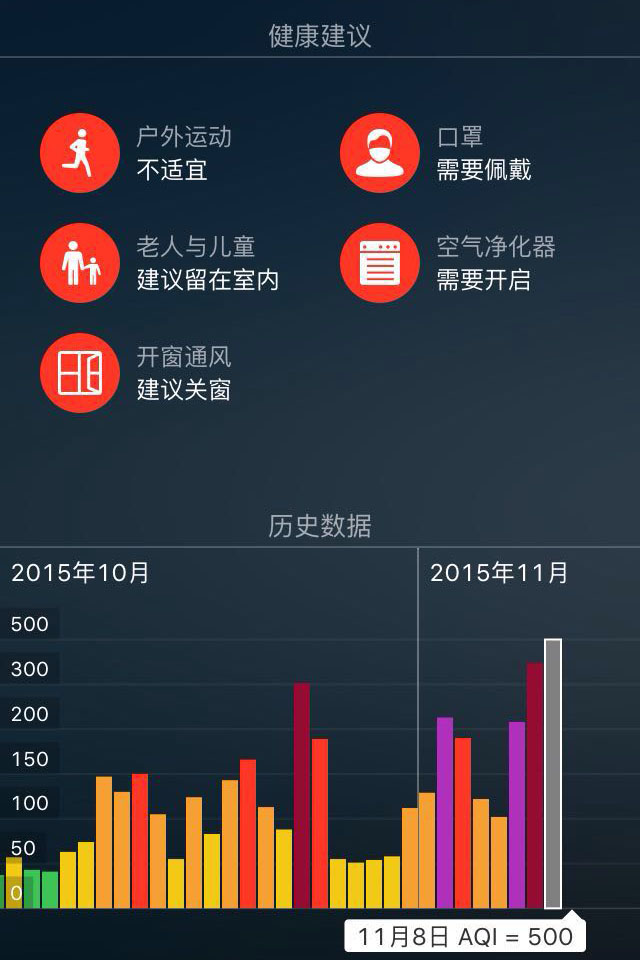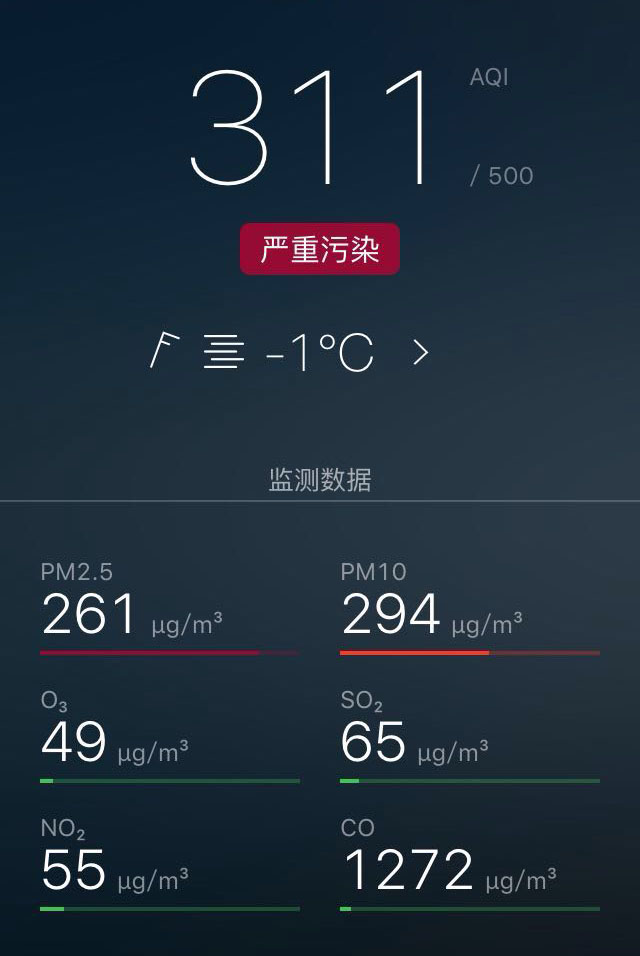 今日(周一)的空氣質量相對周日有所好轉,但依然是處于嚴重污染的狀態(tài),近期外出,口罩成了必備品,老人和兒童留在室內是"安全"的選擇。建議室內養(yǎng)殖一些綠色植物,在不宜開窗換氣的天氣中,綠色植物可以改善室內空氣質量。