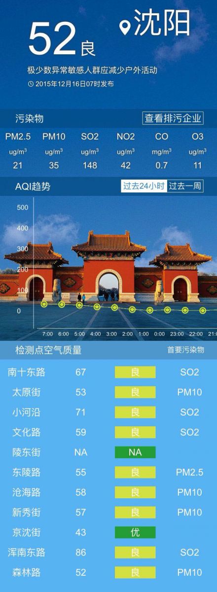 今天是2015年12月16日,星期三。關(guān)注沈城未來幾天的具體天氣:今天上午云量較多,有的地方還會飄落幾個細碎的雪花兒;下午的時候,太陽的光輝將漸漸灑滿我們沈陽大地的每一個角落,偏北風3到4級,最高氣溫-4℃;夜間星斗滿天,偏北風2到3級,最低氣溫-15℃。
