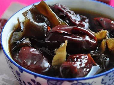 有一款點心,可以每日早、晚餐后各吃一次,有駐顏祛斑、健美豐肌的作用,并可以緩解面部黑斑、形瘦,就是蒸紅棗、木耳。選紅棗10顆,黑木耳15克,冰糖適量。紅棗要用清水泡約2小時,黑木耳用清水泡發(fā)就可以。將它們放碗內(nèi),加清水、冰糖,上籠蒸約1小時即成,非常美味。