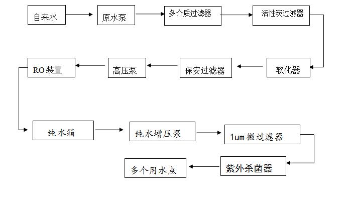 根據(jù)進水水質及行業(yè)對系統(tǒng)產水指標的要求,從系統(tǒng)出力、產品質量、技術先進性、項目投資、運行成本、安全性和環(huán)保效益等方面考慮,依照提高系統(tǒng)性能價格比的原則,我們設計了工作流程如下: